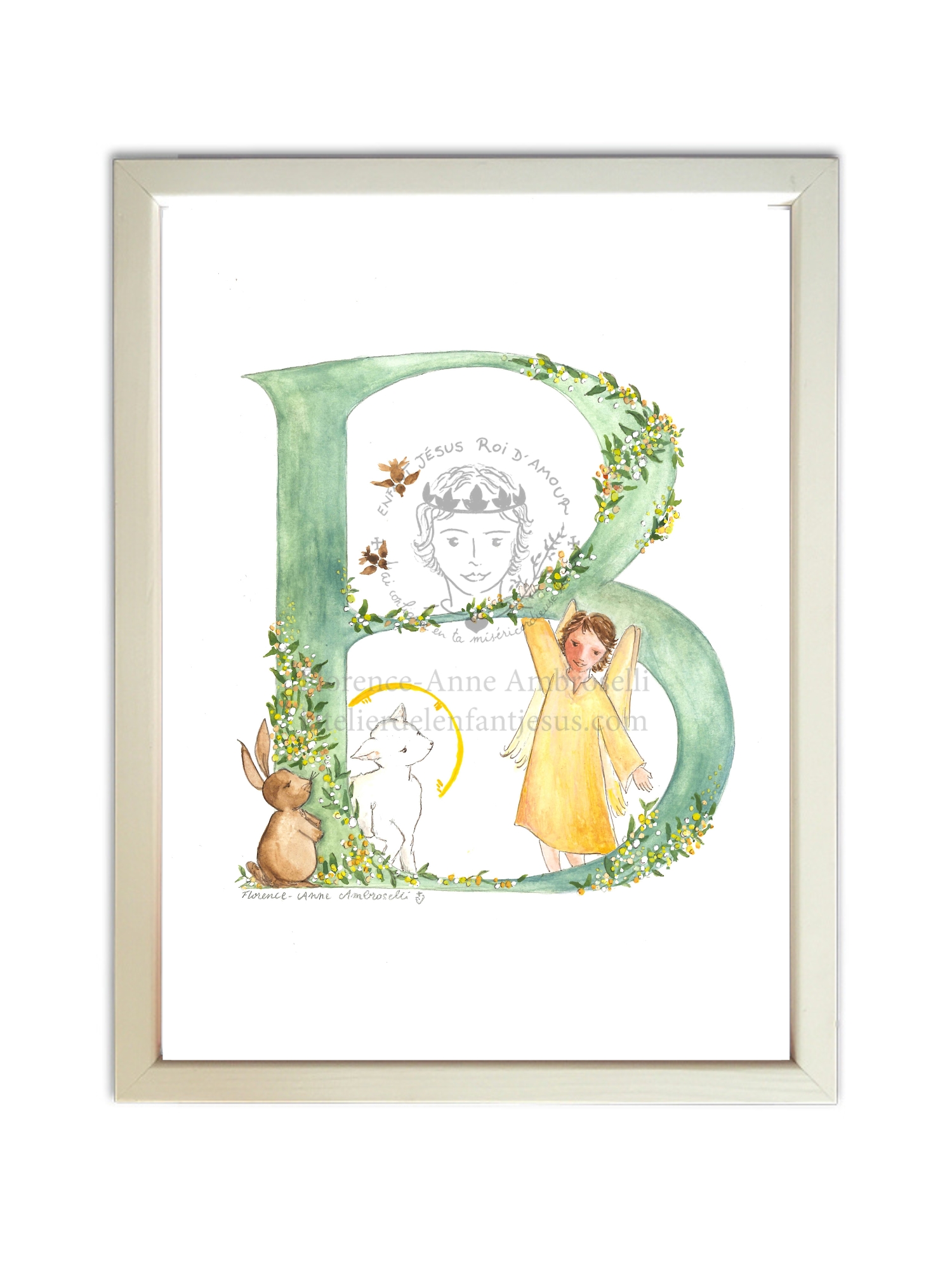 Encadrée en bois blanc, format 18x24, cette belle illustration peut être personnalisée au prénom et à la date de naissance, à la date de baptême, ou à la date de communion...pour accrocher ou poser dans la chambre du bel enfant !