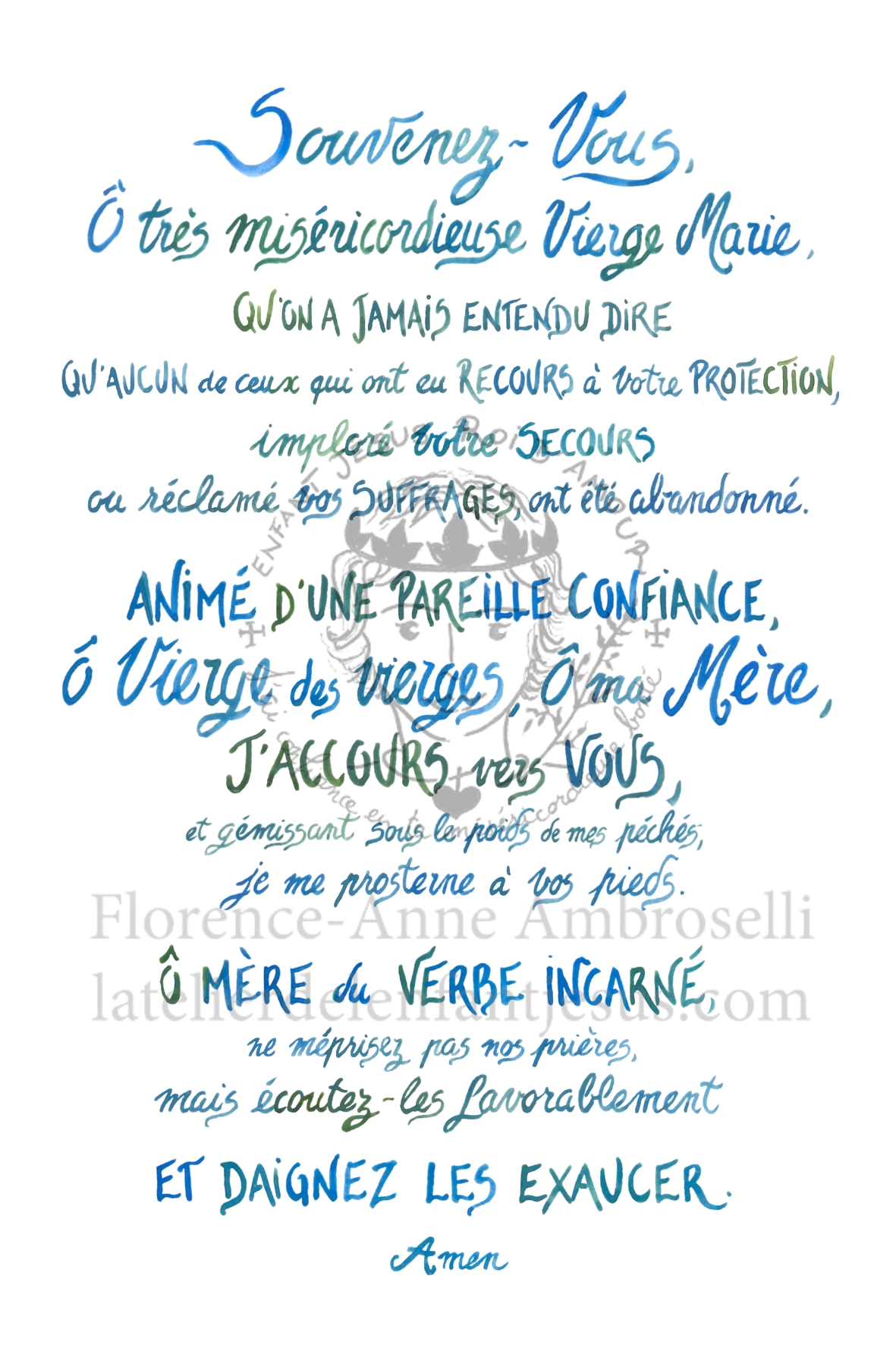 Recto : Prière de Saint Bernard calligraphiée dans les tons bleus